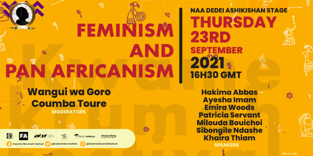 Women matter! There can be no true liberation without women’s liberation, long recognised to be a central aspect in freedom struggles. The conversation in between feminism and pan Africanism is needed to ensure the necessary bridging between the dual struggles that women pursue, in their own movements as much as in male dominated liberation movements. This will be an open discussion session facilitated by Coumba Toure and Wangui Wa Goro, on the 23rd of September at the Hannah Kudjoe Stage.