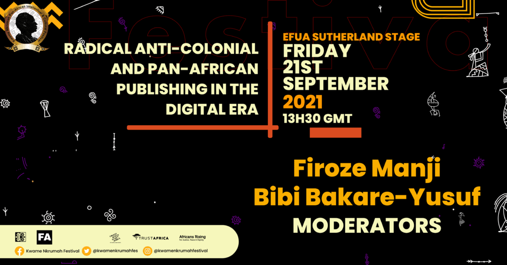 Future planning session on the radical possibilities for anti-colonial, pan-African and feminist publishing that accrue from digitalization. How can Africans take advantage of digital technologies. Participants are invited to consult and share, with open discussion facilitated by two of AFrica’s most radical publisher, Firoze Manji, founder of Daraja Press and Bibi Bakare-Yusuf, founder of Cassave Republic. Scheduled to happen on the 24th of September.