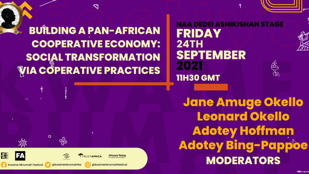 The Pan African dream is not achievable without a thriving Economy. At this session we will explorewhat is takes to build and strengthen the cooperative sector on the continent. Open discussion on future strategies will be facilitated by Adotey Bing-Pappoe, with Adotey Hoffman, Jane Amuge Okello & Leonard Okello, on the final day, 24th of September.